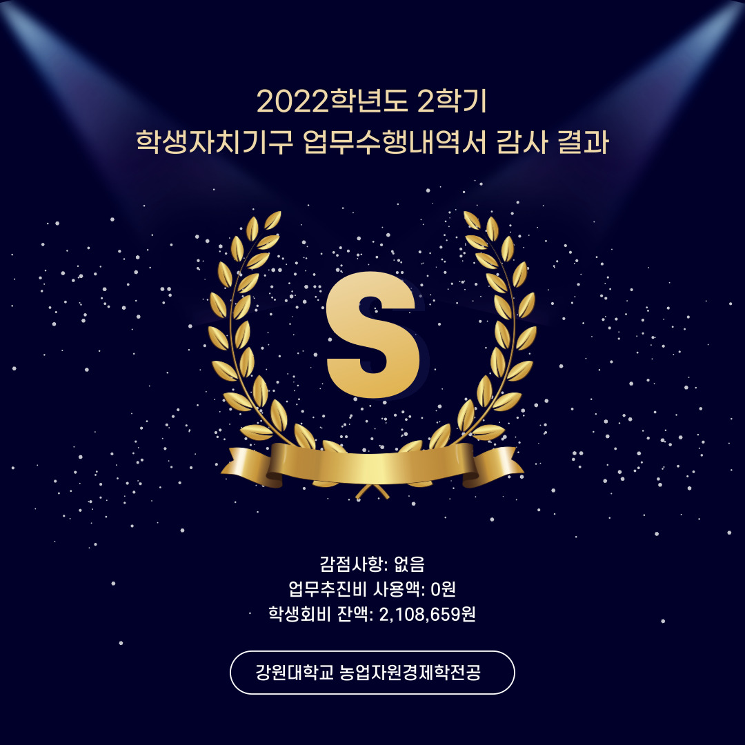 안녕하십니까, 농업자원경제학전공 학생자치기구 비상대책위원회입니다. 2022학년도 2학기 학생자치기구 업무수행내역서 감사 결과를 알려드립니다. 우리 학과는 지난 1학기에 이어, 2학기 역시 ‘S등급’(감점사항 없음)을 달성하였습니다. 2022학년도의 학생자치기구 업무수행내역서 사본은 4월로 계획된 학과 홈페이지 개편 후, 모든 학우 여러분께서 열람하실 수 있도록 학과 홈페이지에 공개될 예정입니다. 농업자원경제학전공 학생자치기구는 학우 여러분께서 납부해주신 소중한 학생회비의 공정하고 투명한 집행을 위해 최선의 노력을 다하겠습니다. 감사합니다. 비상대책위원회 위원장: 조용빈 / 010-6437-9370 비상대책위원회 부위원장: 이윤서 / 010-7250-3691