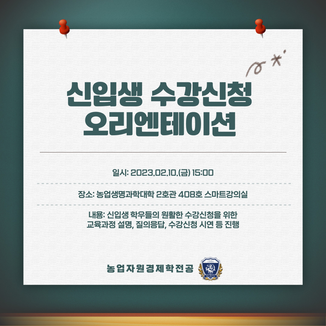 안녕하십니까, 농업자원경제학전공 학생자치기구 비상대책위원회입니다. 지난 2월 10일 15시, 농업생명과학대학 2호관 408호 스마트강의실에서 원예•농업자원경제학부 신입생 학우들을 대상으로 수강신청 오리엔테이션을 진행하였습니다. 조교 선생님들께서 2023학년도 교육과정에 대해 설명해주시고, 원예과학전공 학생회장과 함께 우리 학과 비상대책위원장이 질의응답 및 수강신청 시연을 진행하였습니다. 신입생 여러분의 성공적인 수강신청이 되었길 진심으로 바라겠습니다.